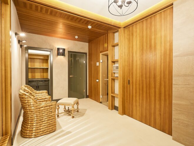 В этом проекте выполнена обшивка стен и потолка шпонированными панелями ( ясень) с тонировкой , так же в комплексе были выполнены раздвижная дверь и открытые полки и фито-бар.